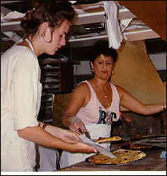 rolled and baked in the open hearth oven, which is a permanent fixture inside the trailer.